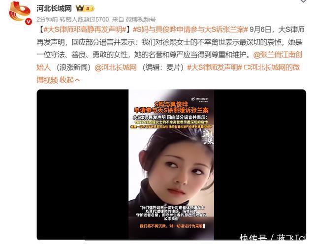 2025年9月6日,女星大S生前的代理律师邓高静发布声明,回应了诸多网络传闻,也向公众透露了与大S有关的官司进展。 今年2月初,女星大S在日本旅游时因感染流感并发肺炎,导致器官衰竭不幸离世,终年48岁。 大S的突然离世令人感到惋惜和难过。 由于事发突然,很多后事都来不及交代。 她的身后事在很长时间内成为网络上的热点话题,比如孩子抚养权问题、遗产问题,以及生前与汪家的官司情况。 通过此前的报道的得知,大S两个孩子的抚养权已转移给汪小菲,遗产则由其丈夫具俊晔和两个孩子共同继承。
